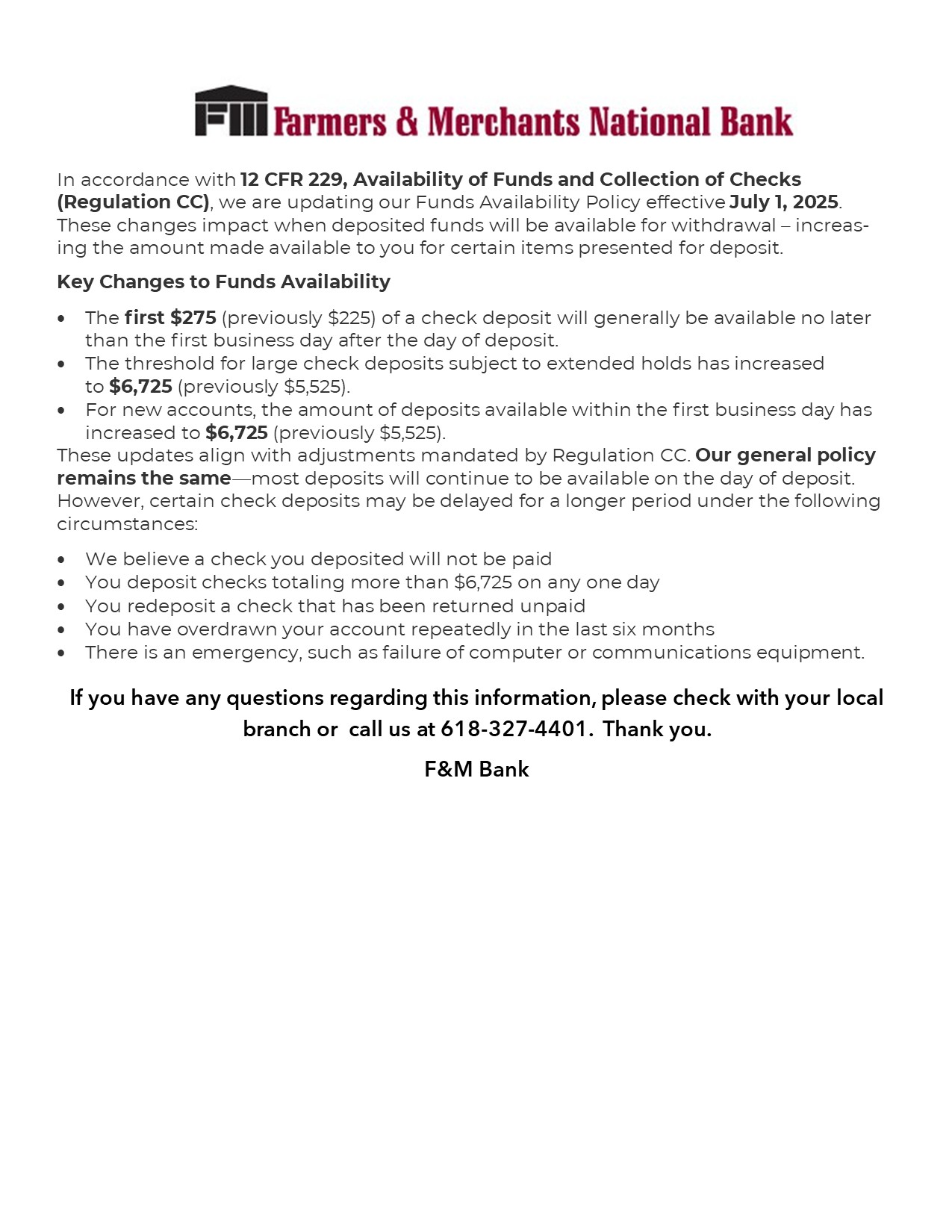 At Farmers and Merchants National Bank, we believe in putting our community first. From small town communities in Washington County to metro communities in St. Clair County, we're committed to making banking simple, friendly and convenient. No matter which of our branches you visit or what your needs are, prepare for a banking experience that makes you feel like a valued member of the community.